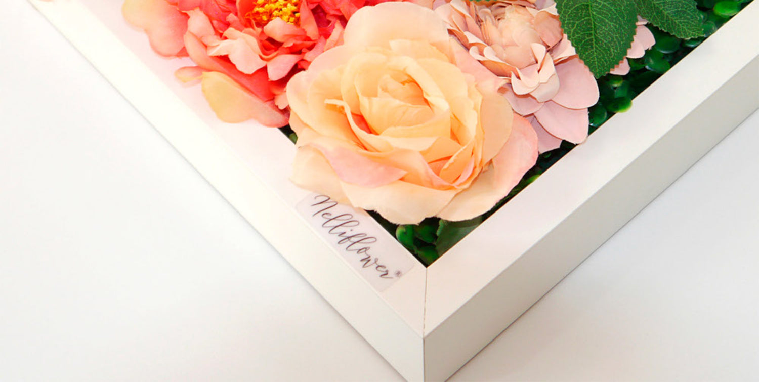 Flowerframe "MELODY" aus Realtouch Kunstpflanzen, Holzrahmen mit weißem Decor